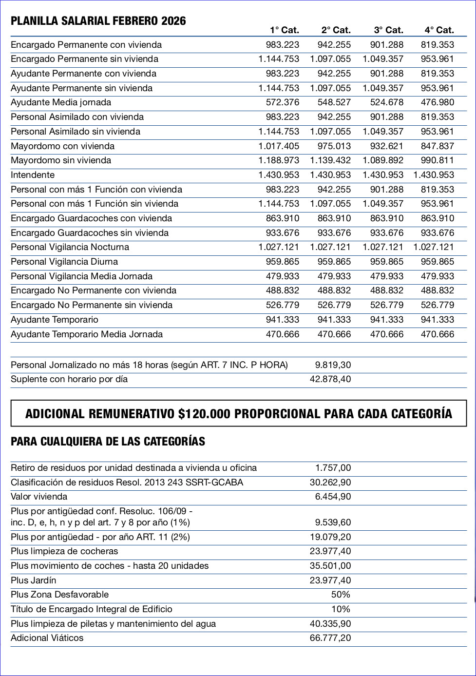 Las presentes planillas, correspondientes al mes de febrero de 2026, incluyen los montos salariales, plus y beneficios de las categorías vigentes en todo el país, para las trabajadoras y trabajadores de edificios incluidos en los CCT 589 y 590/10. La Fateryh acordó con las cámaras del sector empleador, un incremento salarial consistente en un porcentaje del: