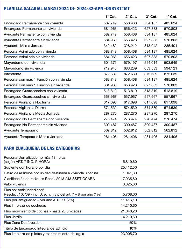 Las presentes planillas incluyen los montos salariales, plus y beneficios de las categorías vigentes en todo el país, para las trabajadoras y trabajadores de edificios incluidos en los CCT 589 y 590/10 correspondientes al mes de marzo.