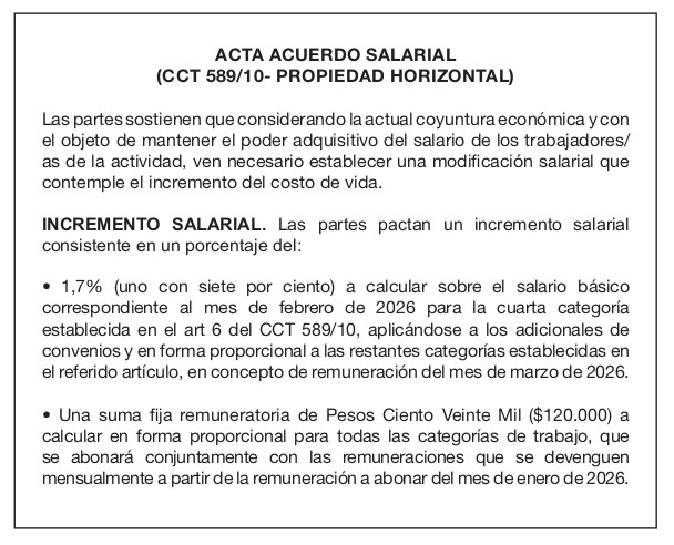 • 1,7 % uno con siete por ciento) a calcular sobre el salario básico correspondiente al mes de febrero de 2026 para la cuarta categoría establecida en el art 6 del CCT 589/10, aplicándose a los adicionales de convenios y en forma proporcional a las restantes categorías establecidas en el referido artículo, en concepto de remuneración del mes de marzo de 2026.