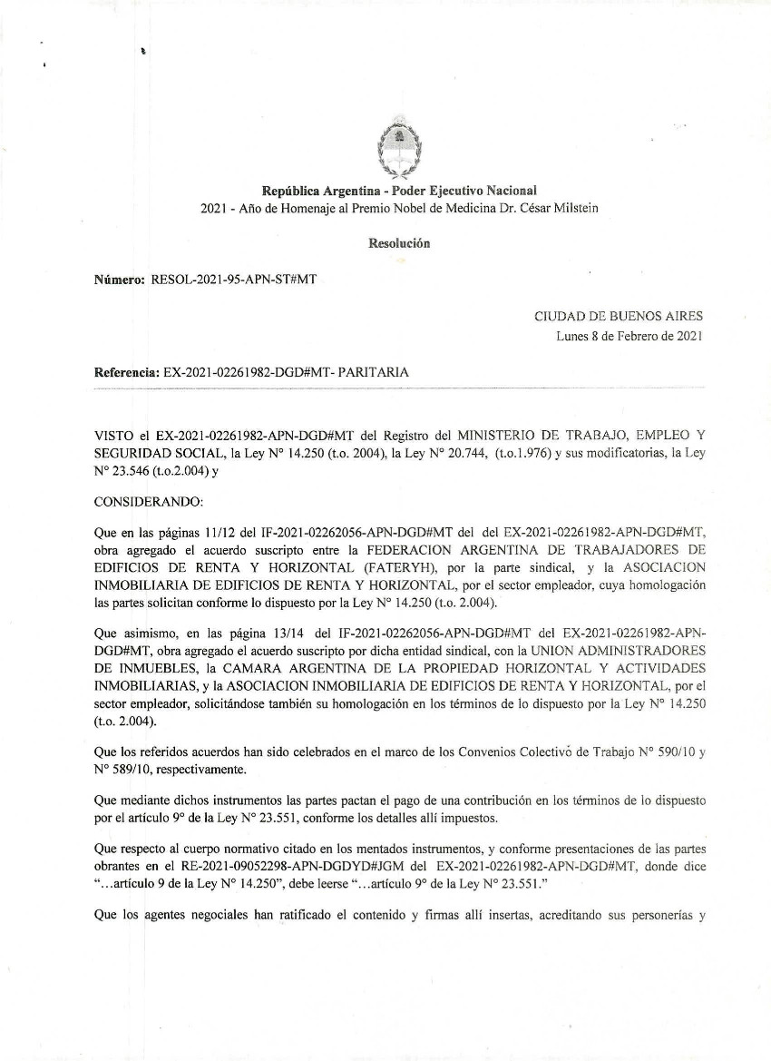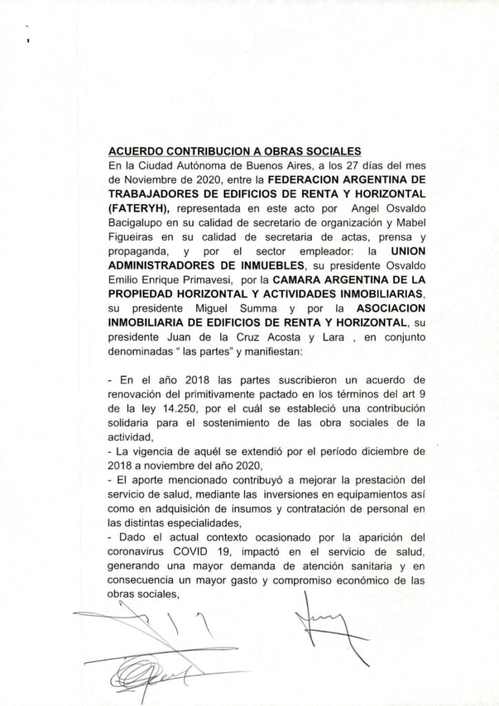 FATERYH y la Unión Administradores de Inmuebles, la Cámara Argentina de la Propiedad Horizontal y Actividades Inmobiliarias y la Asociación Inmobiliaria de Edificios de Renta y Horizontal renovaron el acuerdo para la contribución solidaria de conformidad con el art. 9 de la Ley 14.250 para las obras sociales de la actividad.