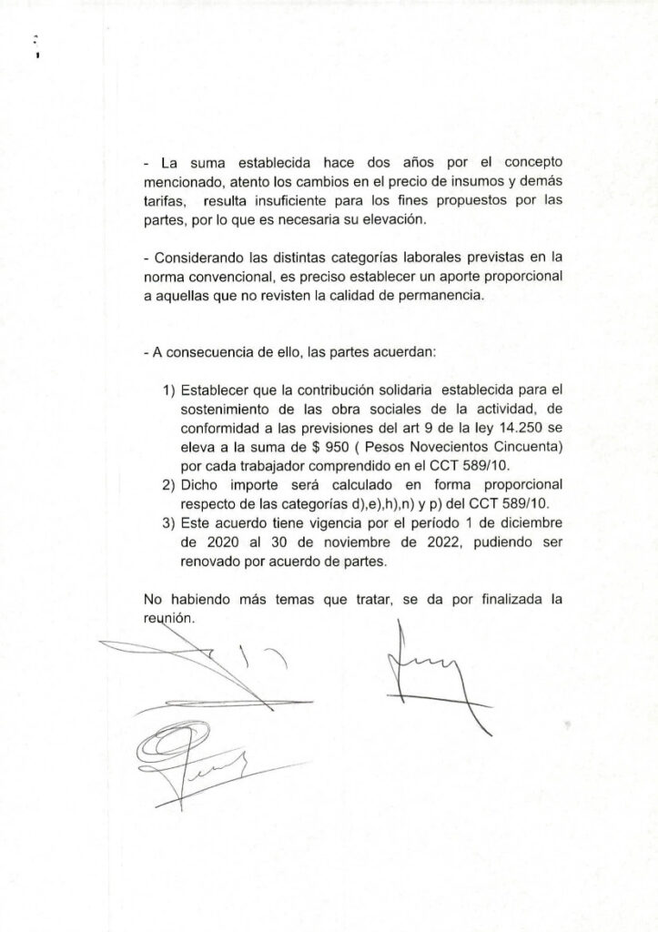 Este acuerdo tiene vigencia a partir del 01/12/2020 y hasta el 30/11/2022. Pasará de $ 250 a $ 950 y es retroactivo a diciembre de 2020. Esto implicara que al momento de rectificar los periodos 12/2020 y 01/2021, deberán pagar la diferencia. Y a partir del periodo 02/2021 en adelante, corresponde pagar por este concepto $ 950.